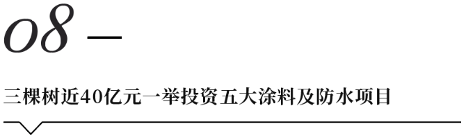 3月1日,三棵树涂料股份有限公司发布公告,公司拟在四川、湖北、安徽三地投建五大项目,总投资额近40亿元。包括四川三棵树涂料生产及配套建设四期项目,投资金额人民币2.94亿元;湖北三棵树年产100万吨涂料及配套建设项目,投资金额人民币13.67亿元;湖北大禹新型防水材料生产及配套扩建项目,投资金额人民币4.32亿元;安徽三棵树涂料生产及配套建设三期项目,投资金额人民币3.55亿元;安徽三棵树涂料生产及配套建设四期项目投资金额人民币15.75亿元。(中国建筑防水协会)
